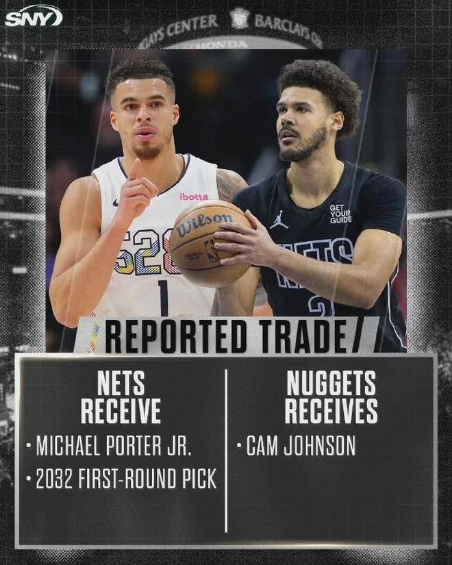 今夏休赛期,掘金将小波特和一个32年无保护首轮签送去篮网,换回卡梅伦-约翰逊。本赛季至今,约翰逊场均11分3.4板2.1助,投篮命中率46.8%,场均以40%命中率扔进1.6记三分球,掘金以13胜5负排名西部第五。