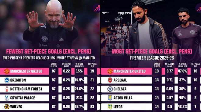 本赛季至今,曼联13轮英超比赛已经通过定位球打进10球,和踢了14轮的阿森纳持平。